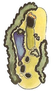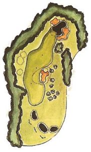 Tight tee shot landing area, guarded by bunkers on each side. The approach shot is a two-tiered green.