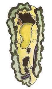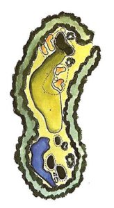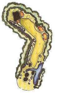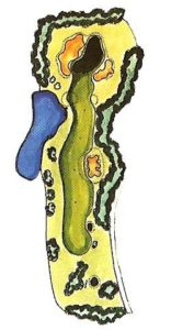 Tough hole. Must hit a long tee shot, down the right-center of the fairway. Tee shots to the left will be blocked out by tall pines.