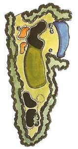 A large lagoon backed by a rambling sand bunker, await approach shots short of the green.