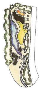 A tee shot to the right side of the fairway will find many problems. First a large overhanging tree, followed by a large bunker with more trees in front of it.